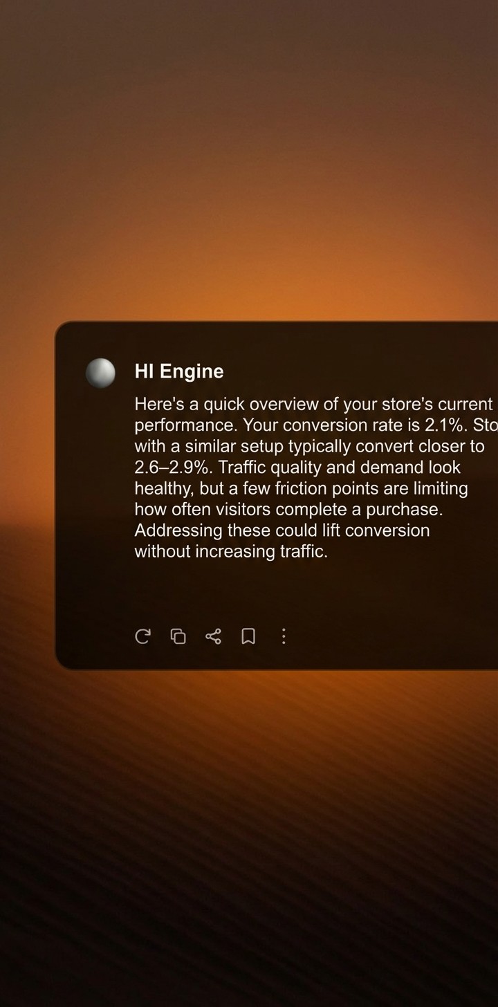 HI Engine monitors your store continuously, analyzing live signals across your commerce stack and surfacing actionable opportunities